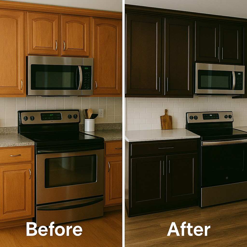 Cabinet refinishing restores your existing cabinets by sanding, staining, or applying a new finish to refresh their appearance without replacing any components.